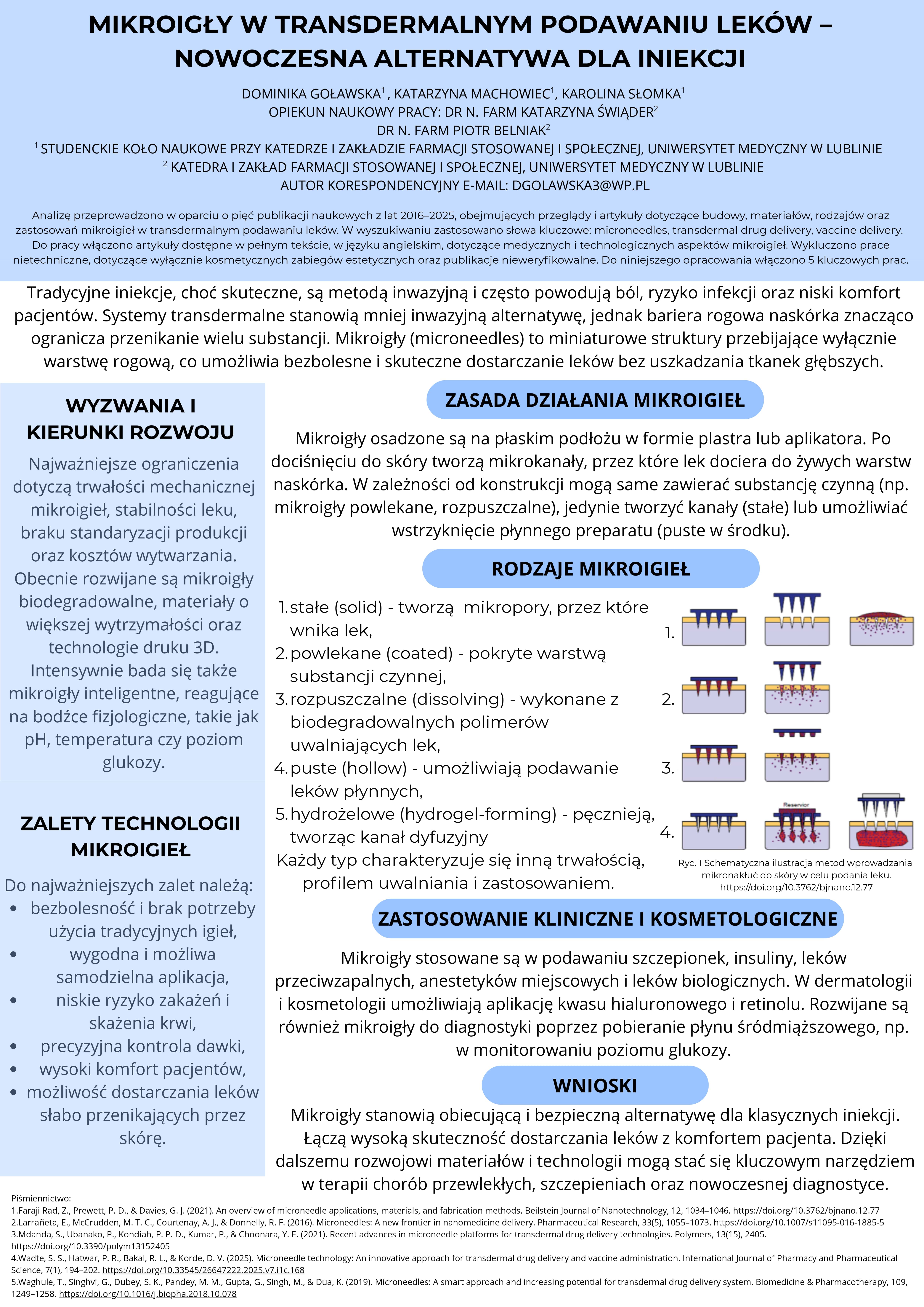 1 miejsce MIKROIGŁY W TRANSDERMALNYM PODAWANIU LEKÓW – NOWOCZESNA ALTERNATYWA DLA INIEKCJI, Dominika Goławska, Katarzyna Machowiec, Karolina Słomka