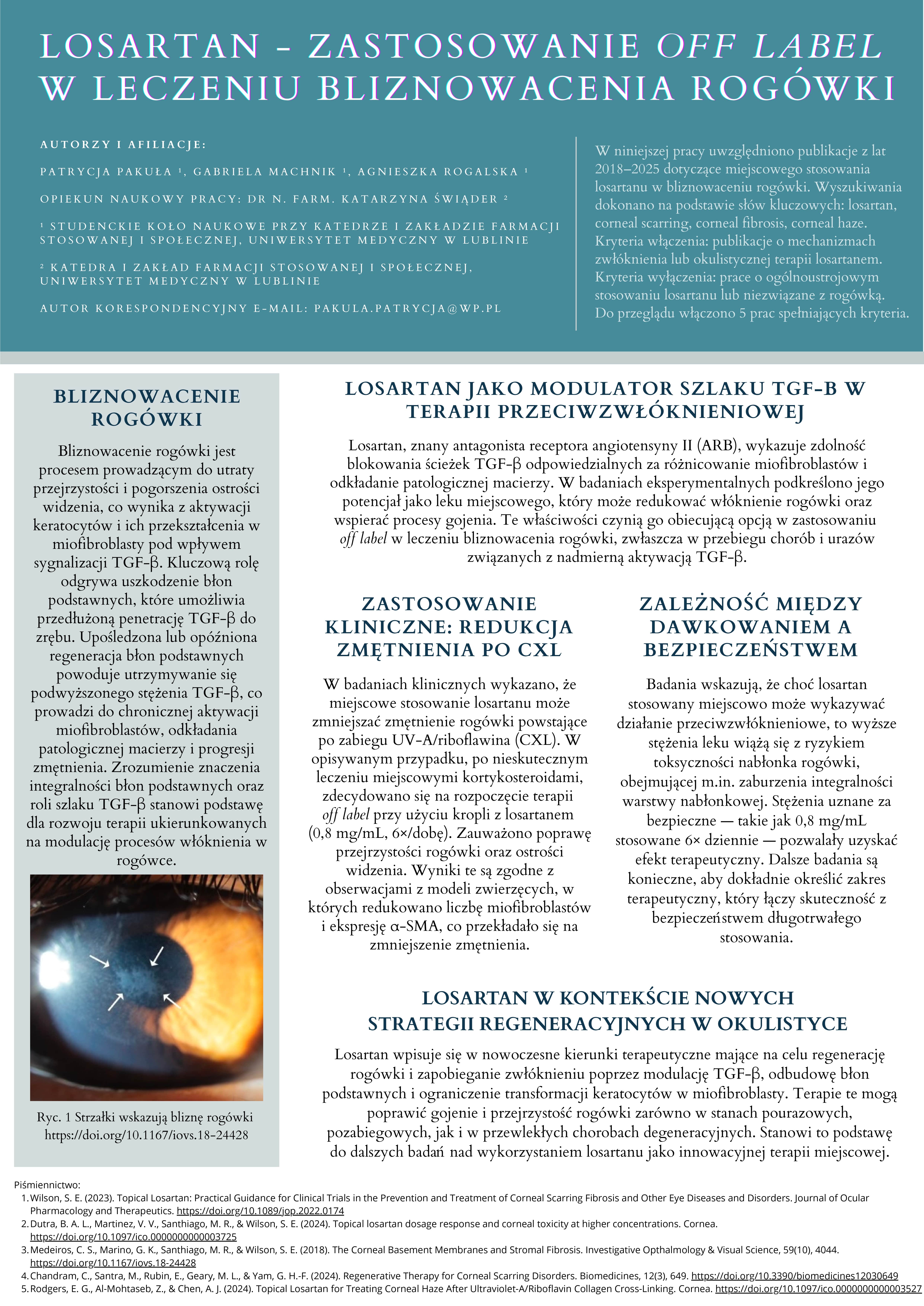 2 miejsce LOSARTAN – ZASTOSOWANIE OFF LABEL W LECZENIU BLIZNOWACENIA ROGÓWKI, Patrycja Pakuła, Gabriela Machnik, Agnieszka Roglaska