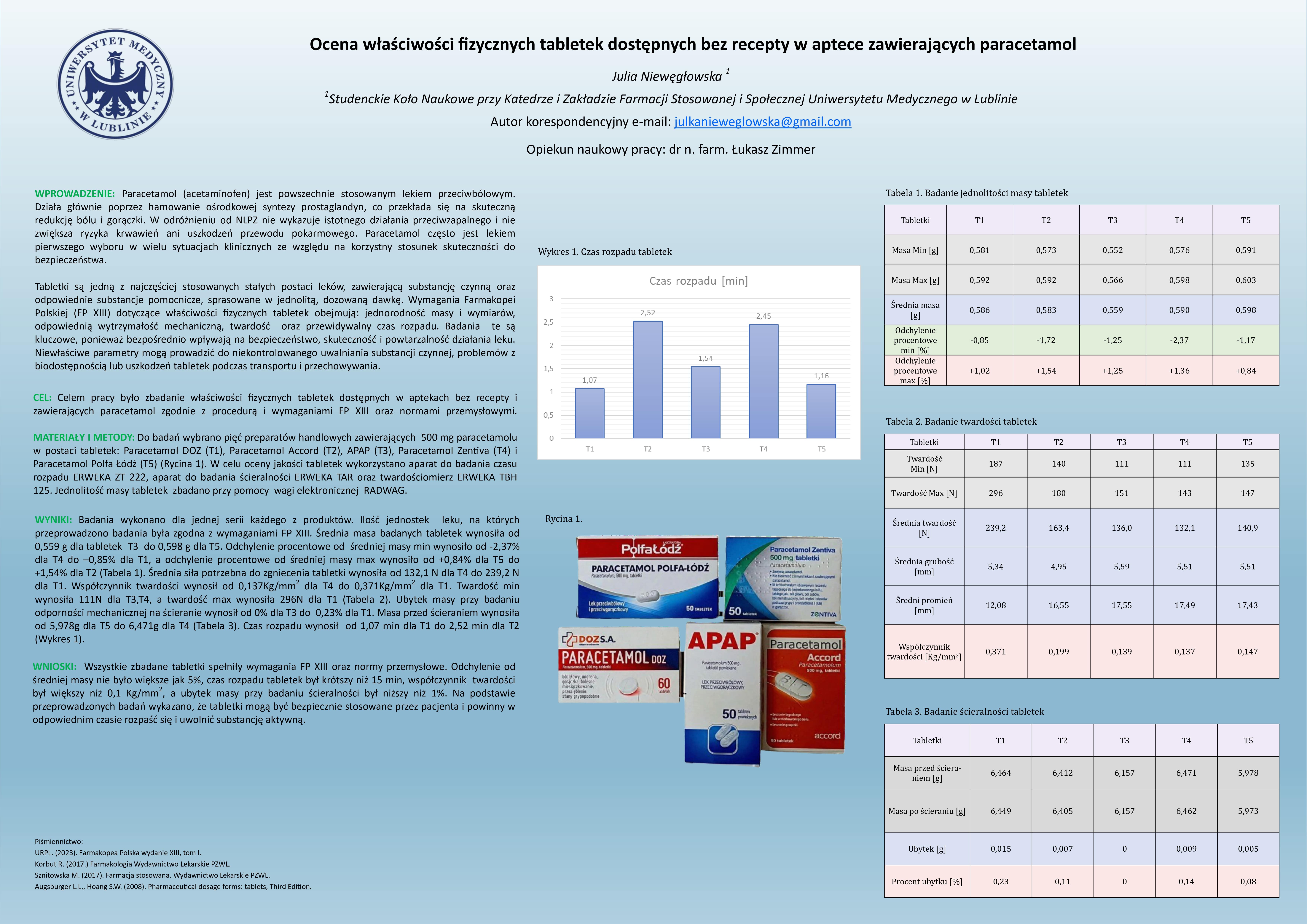 3 miejsce OCENA WŁAŚCIWOŚCI FIZYCZNYCH TABLETEK DOSTĘPNYCH BEZ RECEPTY W APTECE ZAWIERAJĄCYCH PARACETAMOL, Julia Niewęgłowska