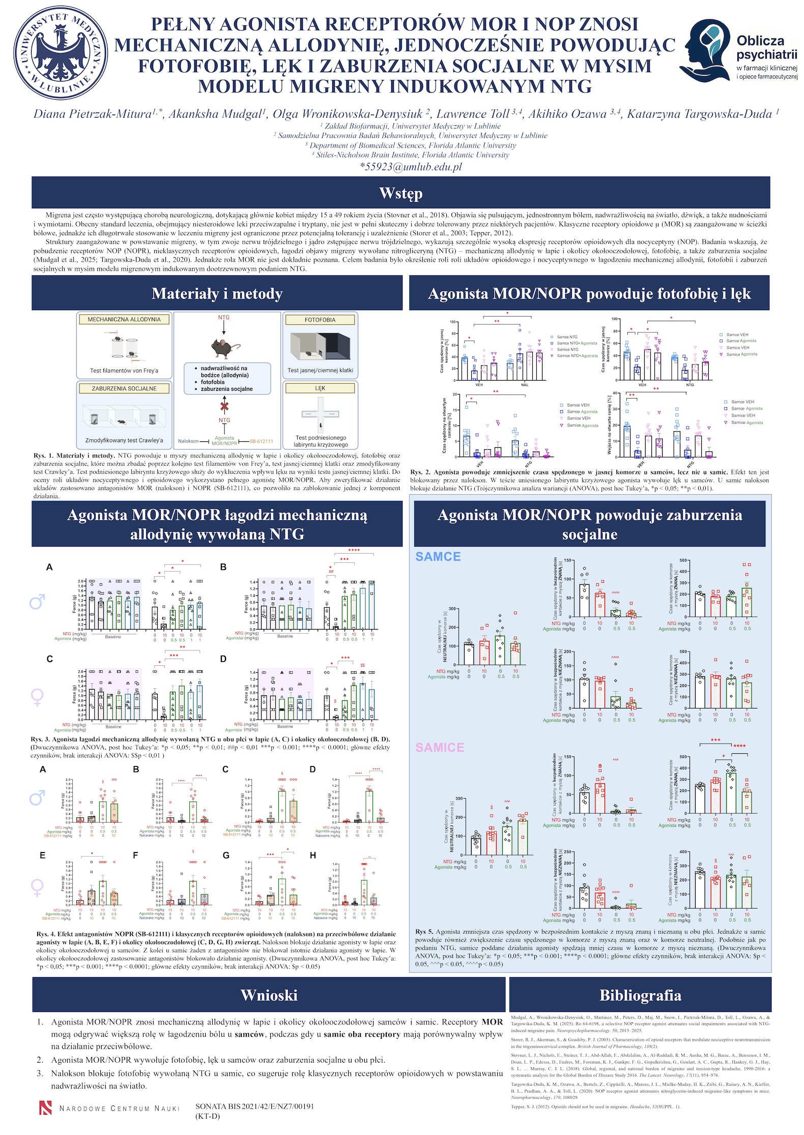 1 miejsce PEŁNY AGONISTA RECEPTORÓW MOR I NOP ZNOSI MECHANICZNĄ ALLODYNIĘ, JEDNOCZEŚNIE POWODUJĄC FOTOFOBIĘ, LĘK I ZABURZENIA SOCJALNE W MYSIM MODELU MIGRENY INDUKOWANYM NTG, Diana Pietrzak-Mitura, Akanksha Mudgal, Olga Wronikowska-Denysiuk , Lawrence Toll, Akihiko Ozawa, Katarzyna Targowska-Duda