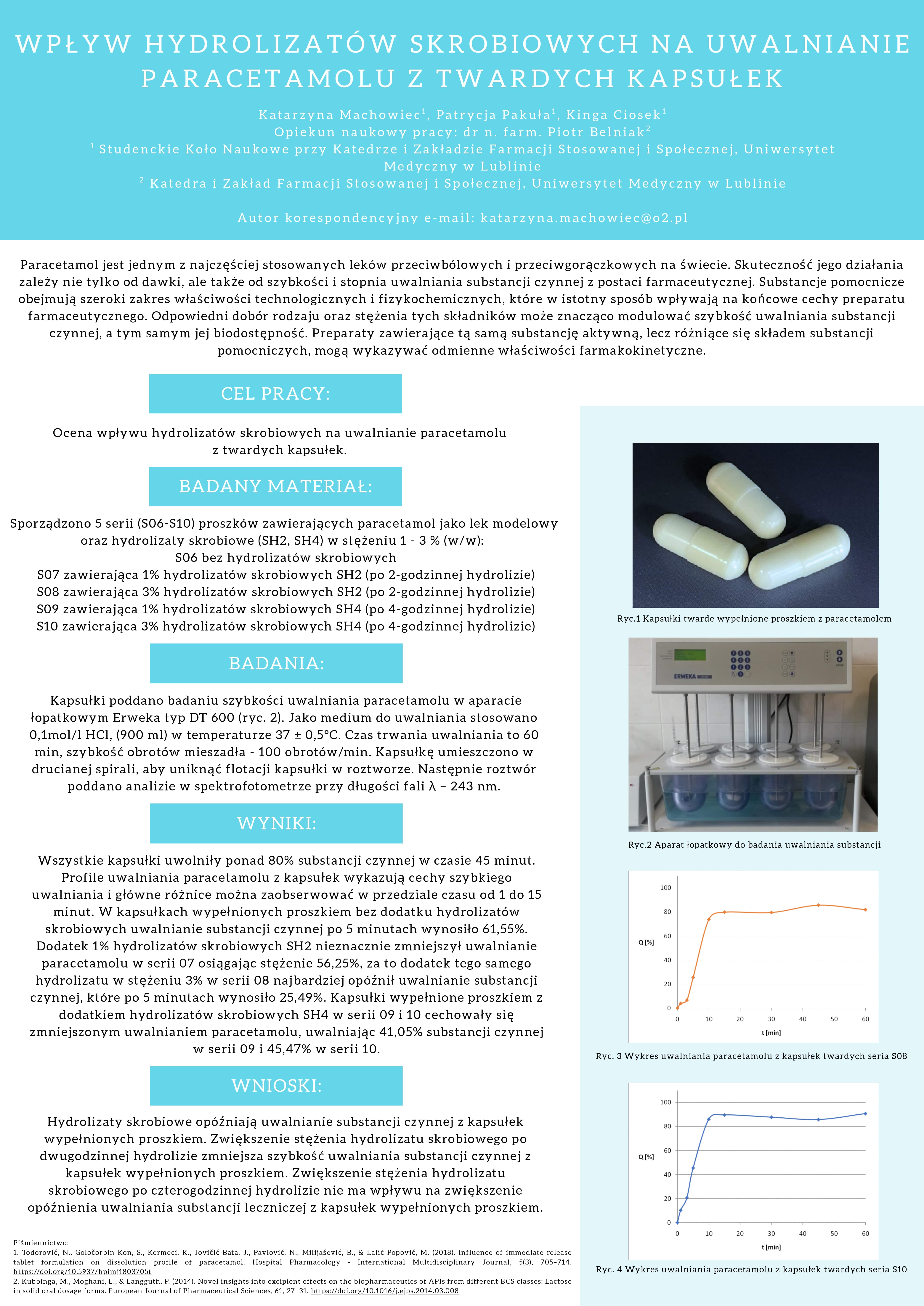 2 miejsce WPŁYW HYDROLIZATÓW SKROBIOWYCH NA UWALNIANIE PARACETAMOLU Z TWARDYCH KAPSUŁEK, Katarzyna Machowiec, Patrycja Pakuła, Kinga Ciosek